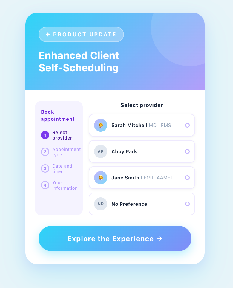 Your booking flow is often the very first experience a new client has with your practice. We've redesigned Healthie's self-scheduling experience from the ground up to reduce drop-off and help more clients complete their bookings with confidence.
