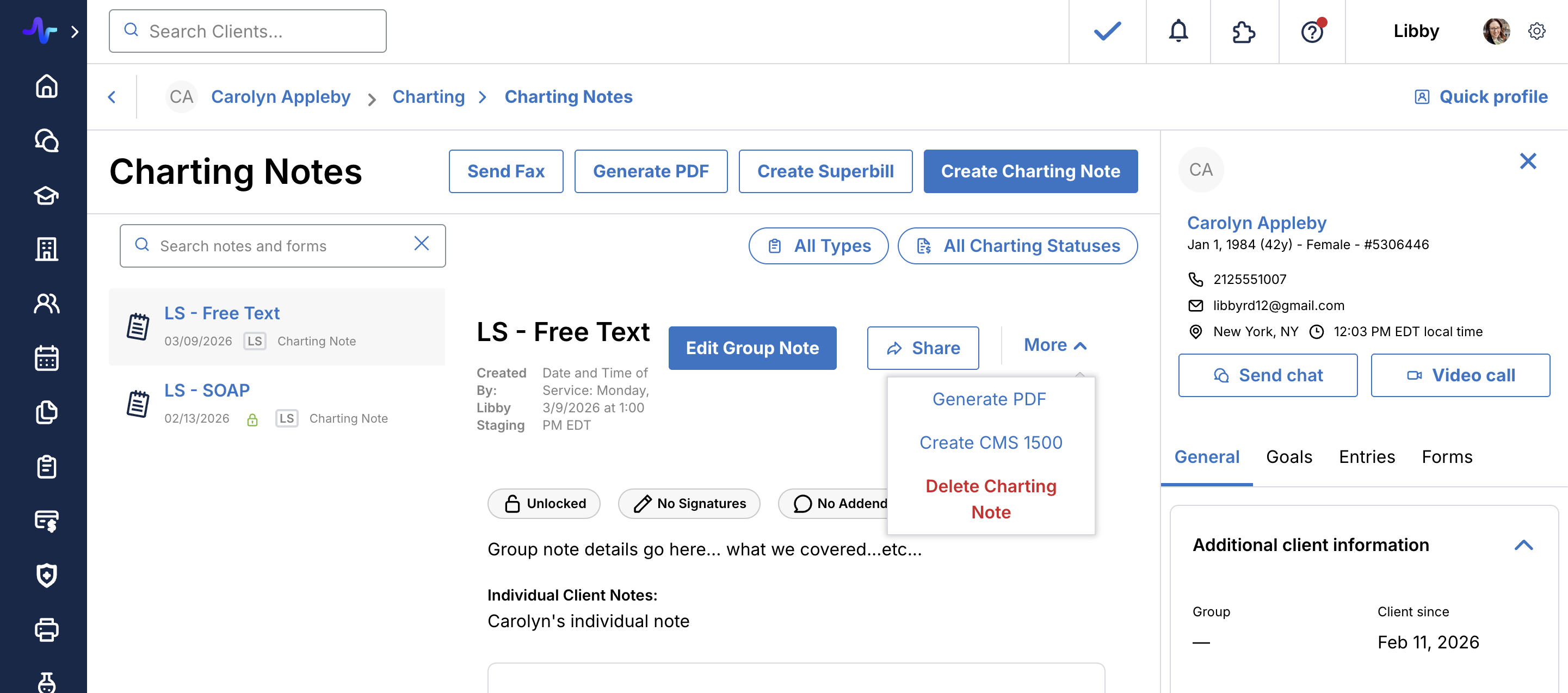 - Generate CMS 1500 claims from individual notes inside a group chart note - the same way you would from a 1:1 session note.