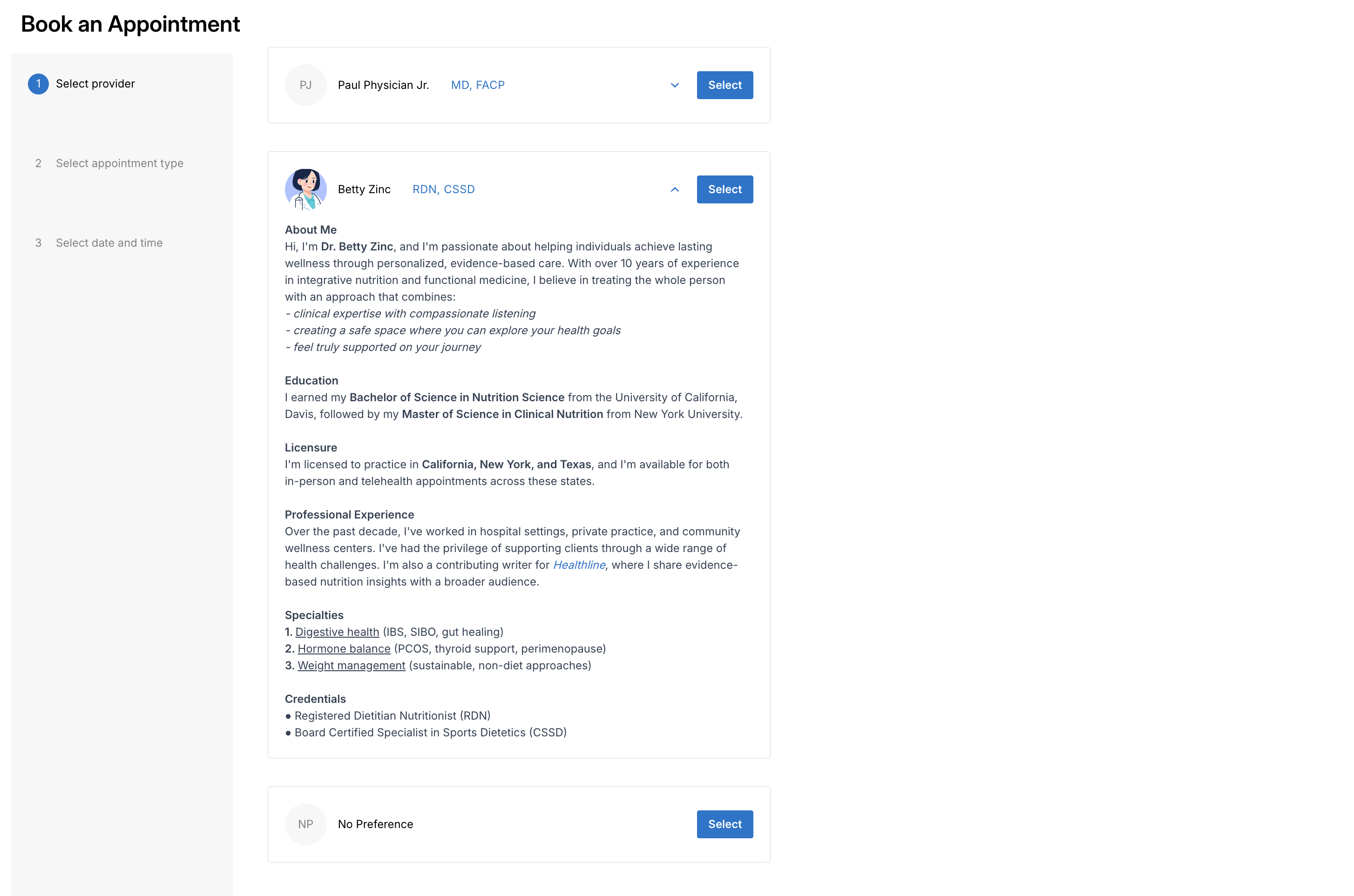 Healthie’s Provider Bios feature allows providers to add a short, formatted bio that appears directly within the scheduling flow. When clients reach the Choose Provider step, they can expand to read more about each provider’s background, specialties, and care philosophy — all before booking.