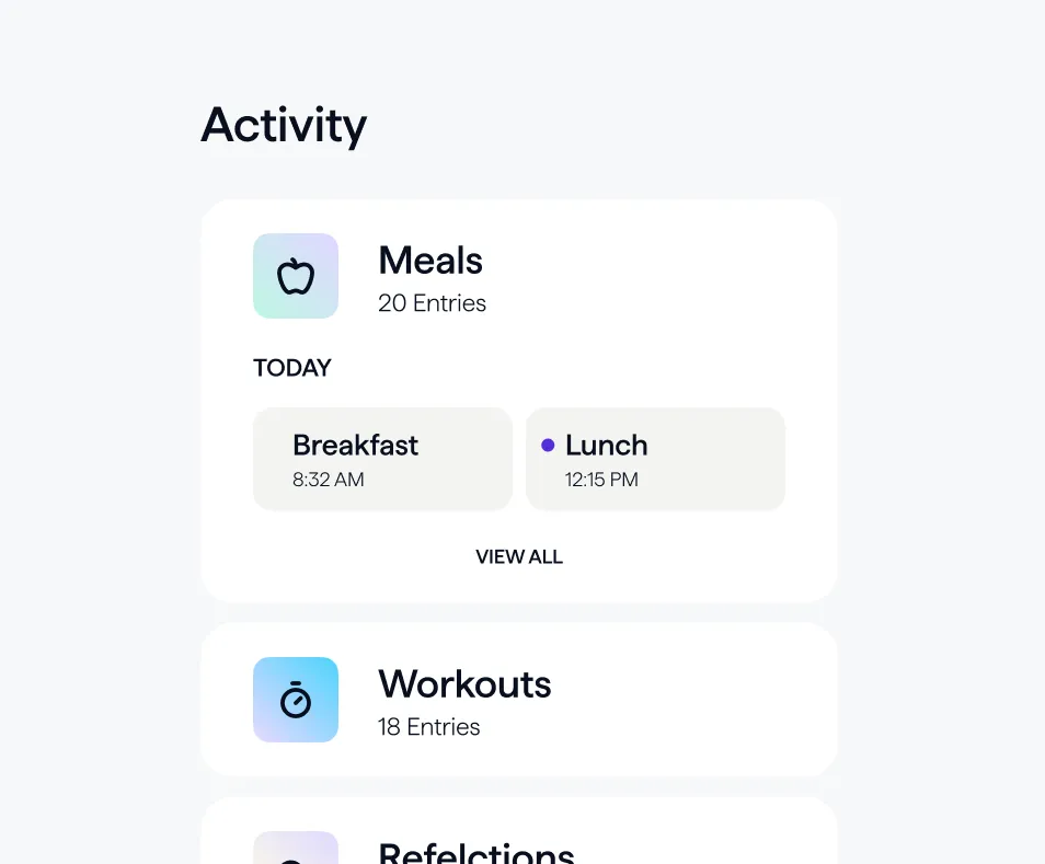 Powerful coaching tools to log meals, workouts, and deliver care.